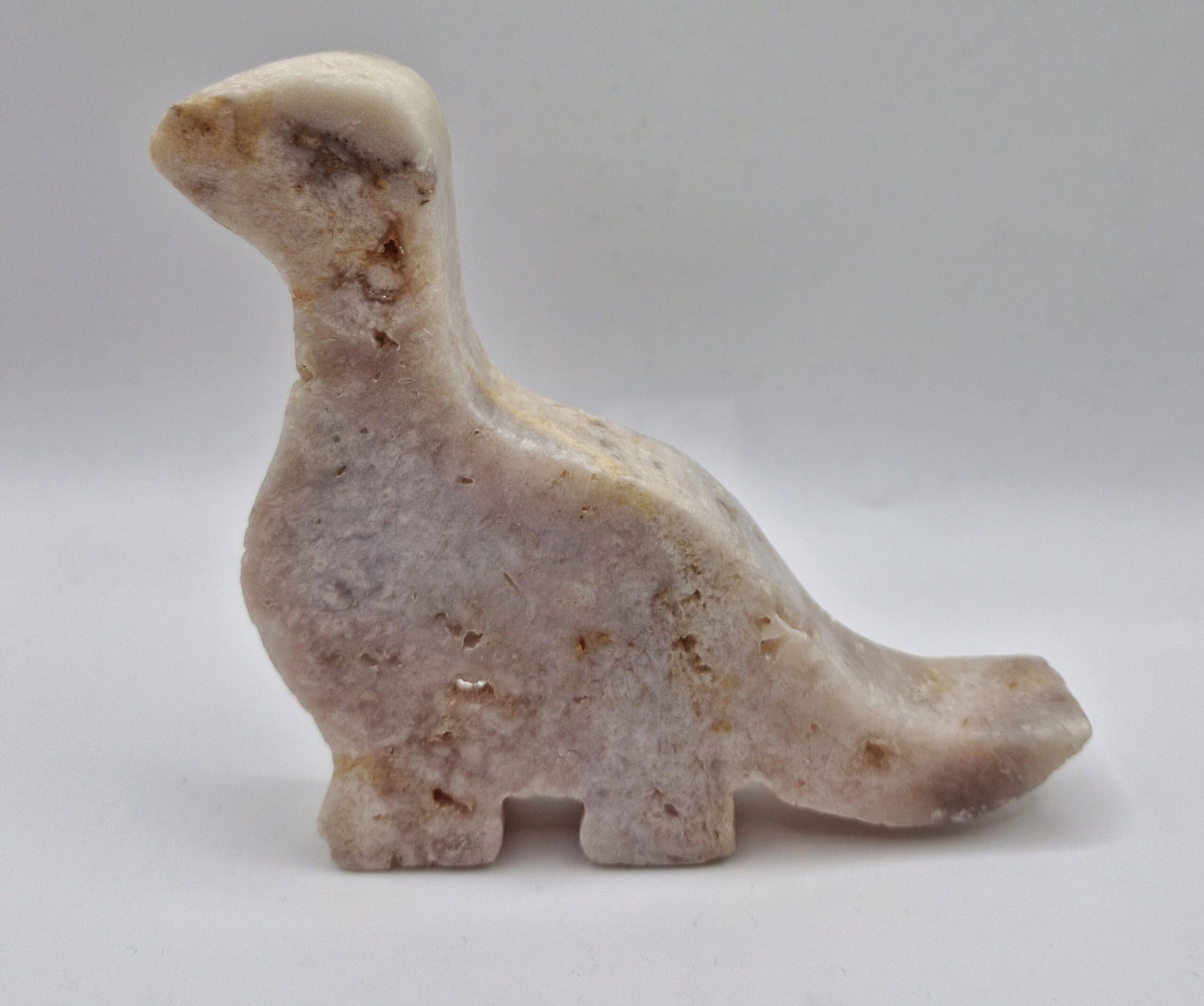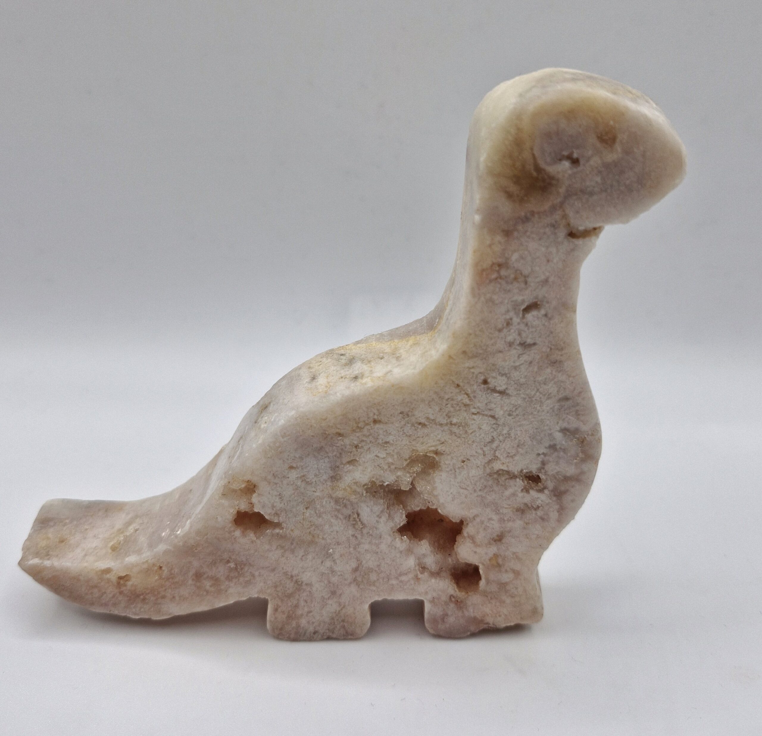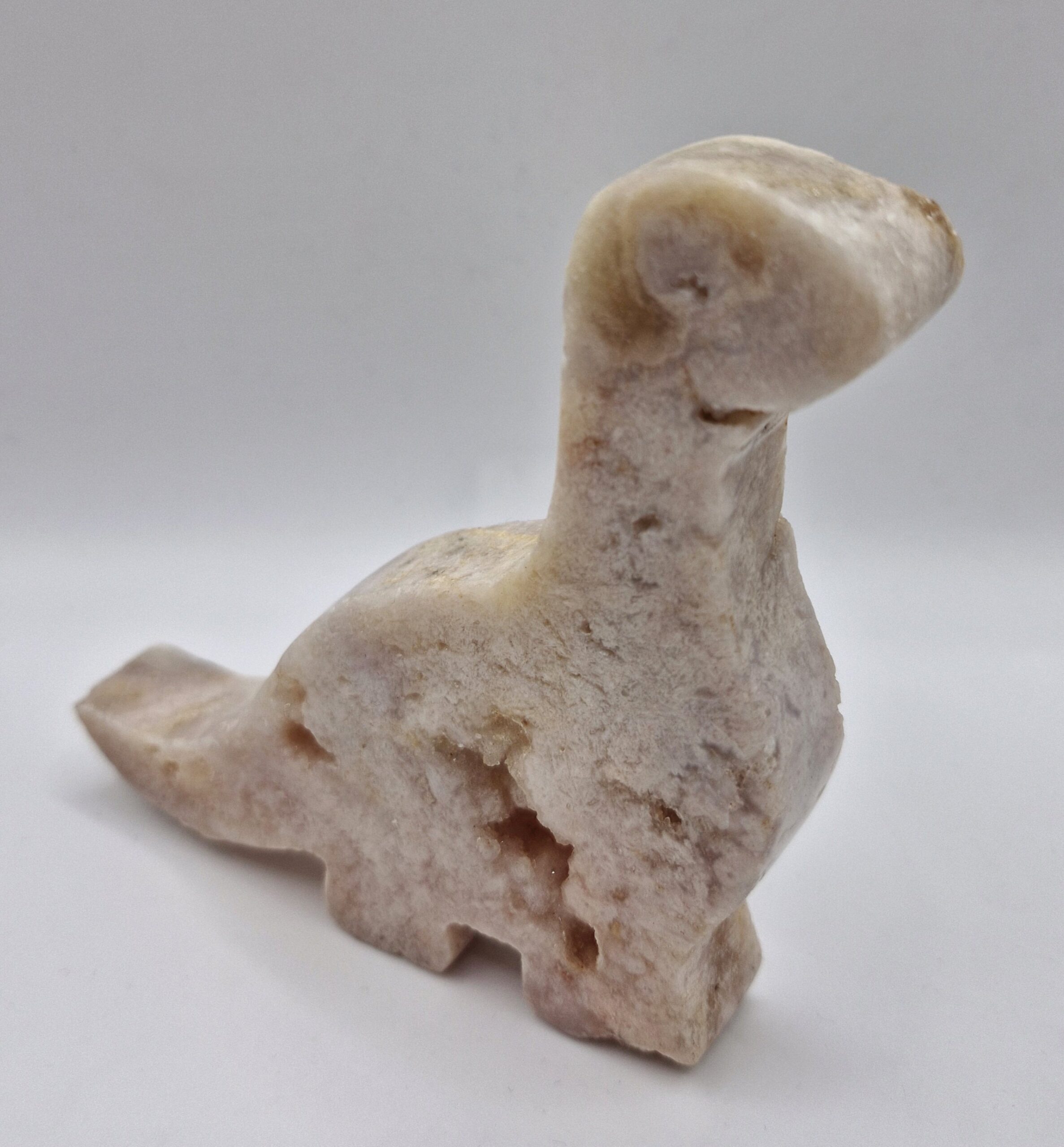 Grappig figuur, een dinosaurus, van roze Chalcedoon (pink amethist) uit Brazilië.